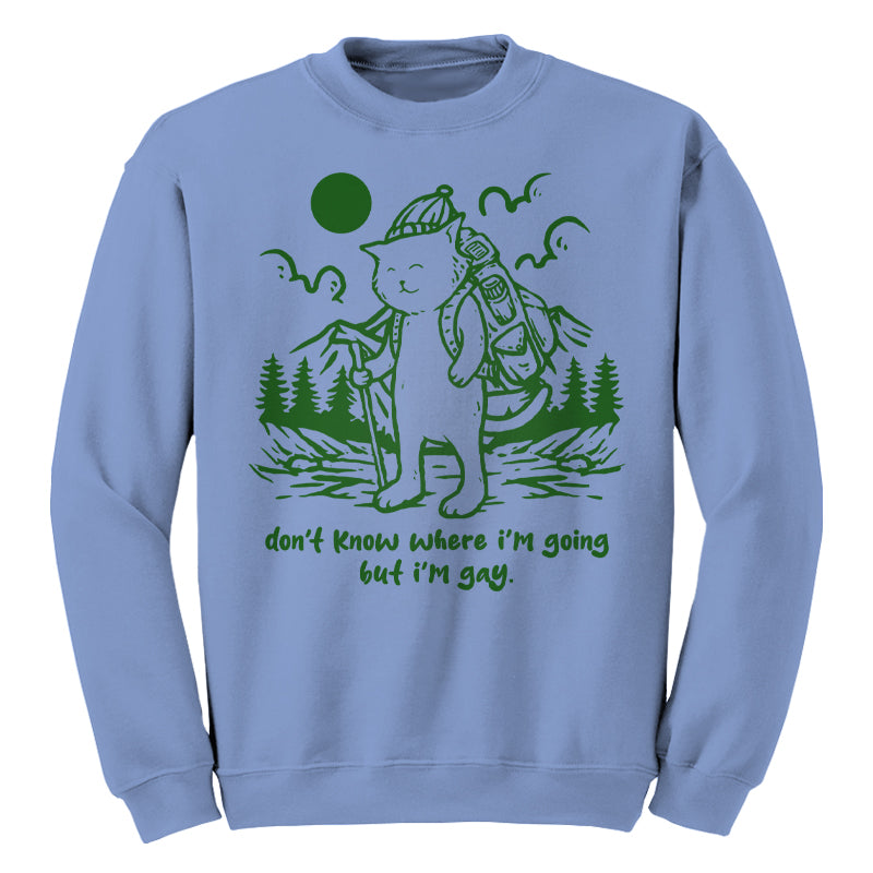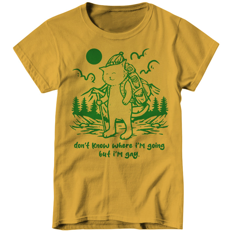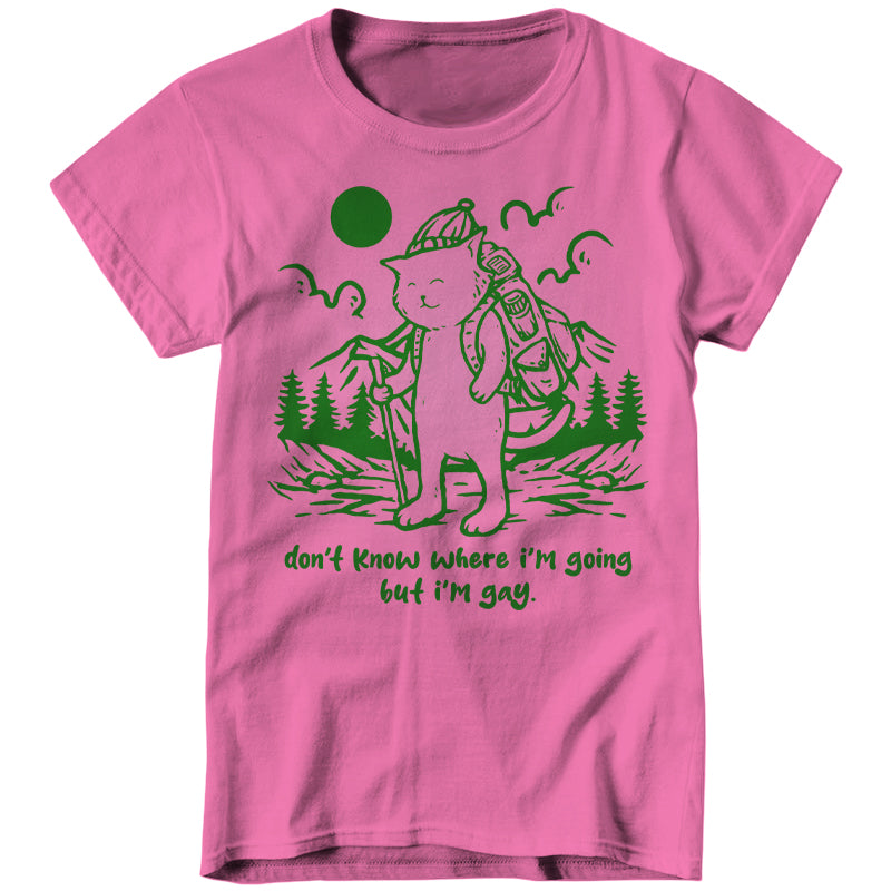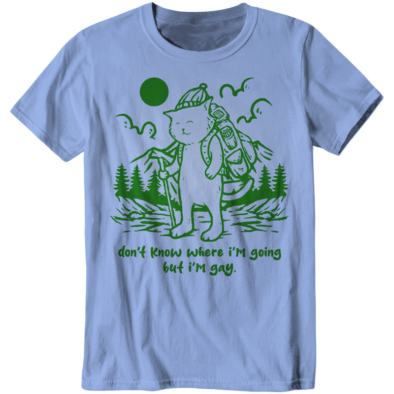 Introducing the "Don't Know Where I'm Going But I'm Gay" t-shirt—perfect for those carefree days when you embrace your fabulousness without a roadmap! This playful hiking cat design features a bold, vibrant green color and whimsical graphics that celebrate LGBTQ+ pride. Whether you're marching in a parade, lounging with friends, or just strutting your stuff around town, this tee will keep the good vibes flowing and the laughter rolling. Wear it with pride and a wink, because who needs directions when you're just being beautifully you? 🌈✨