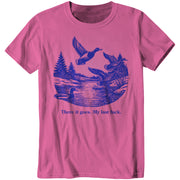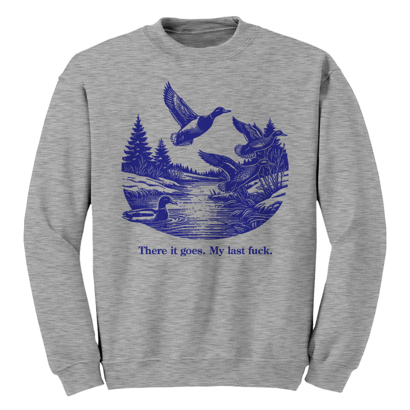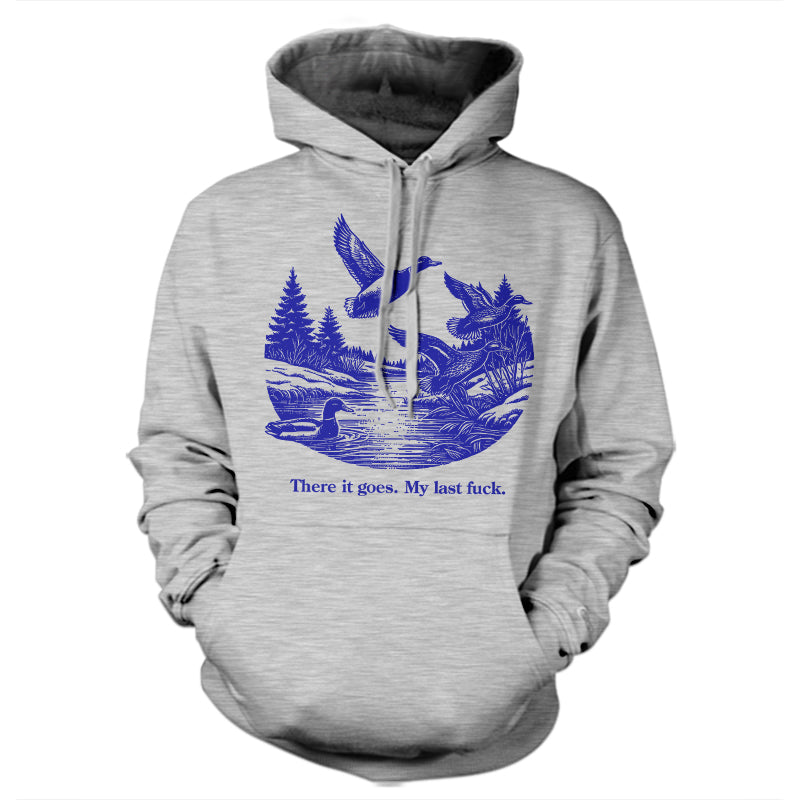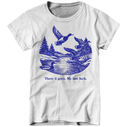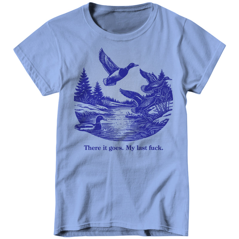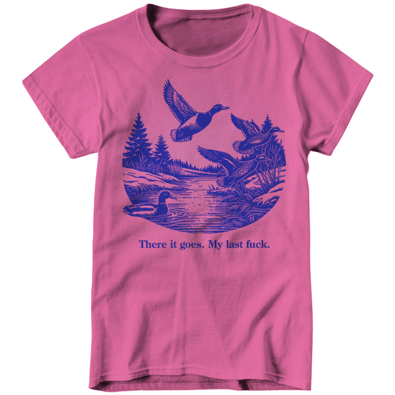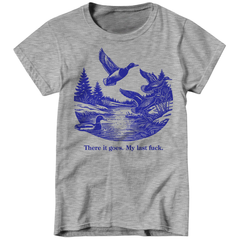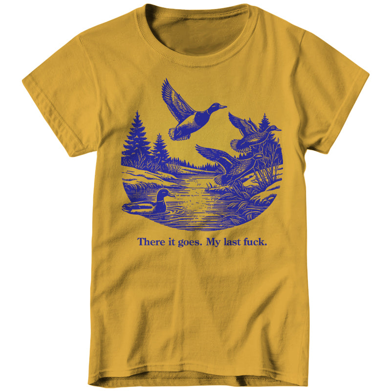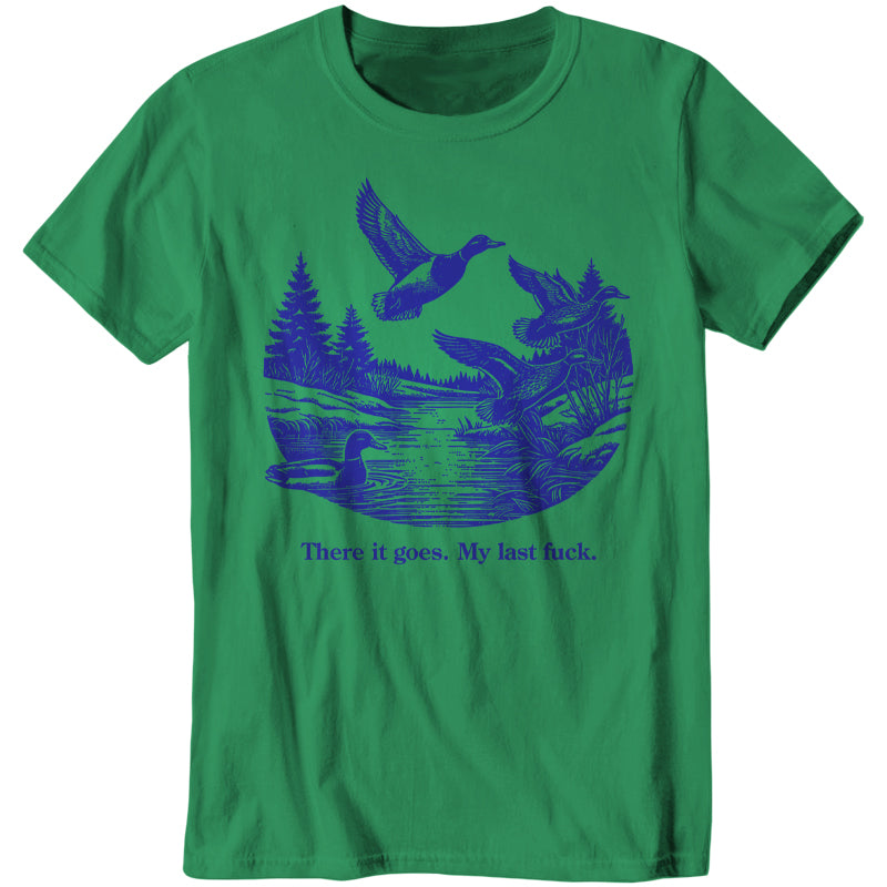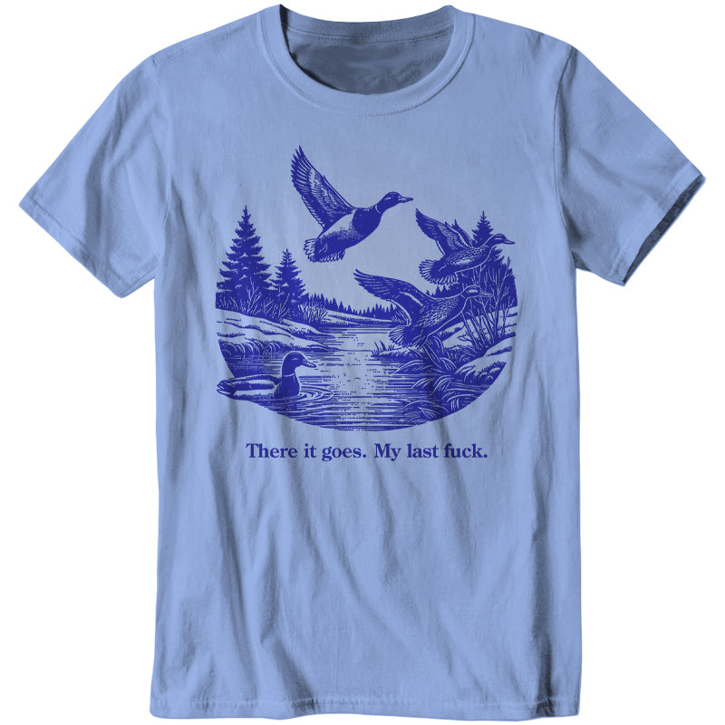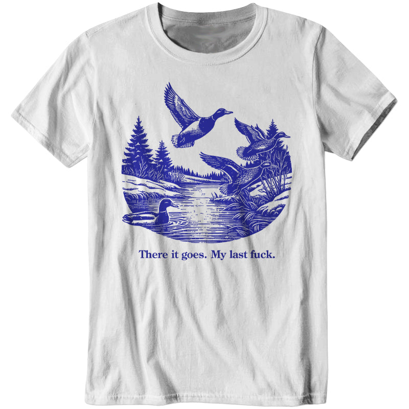 Watch it fly away into the sunset—literally. This tee features a serene pond scene with ducks taking flight, perfectly capturing that magical moment when your final fuck gracefully migrates south for the winter, never to return.